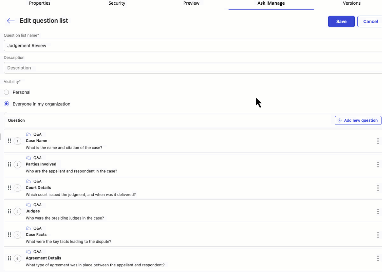 Visibility: Lists can now be marked as either Personal (visible only to the creator) or Organization (visible to everyone with access to Ask iManage). This means that you can work on personal question lists until you’re ready to publish them to the rest of your team.
