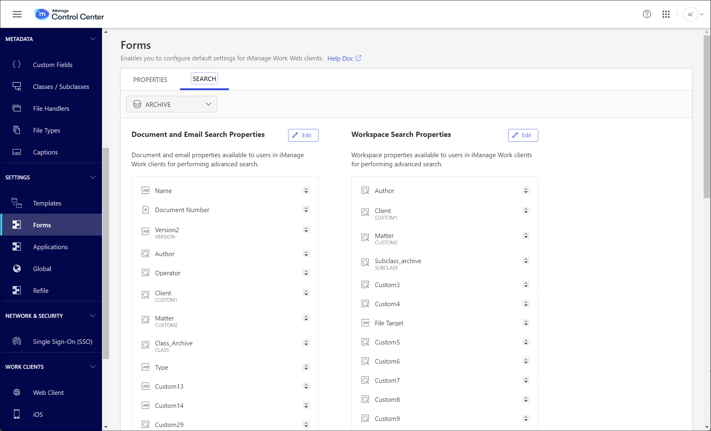 Document and Email properties | Lets you define the Document and Email properties that appear in iManage Work clients when a user is editing/viewing a Document or Email profile. Typically, these properties should match the Folder properties for consistency. |