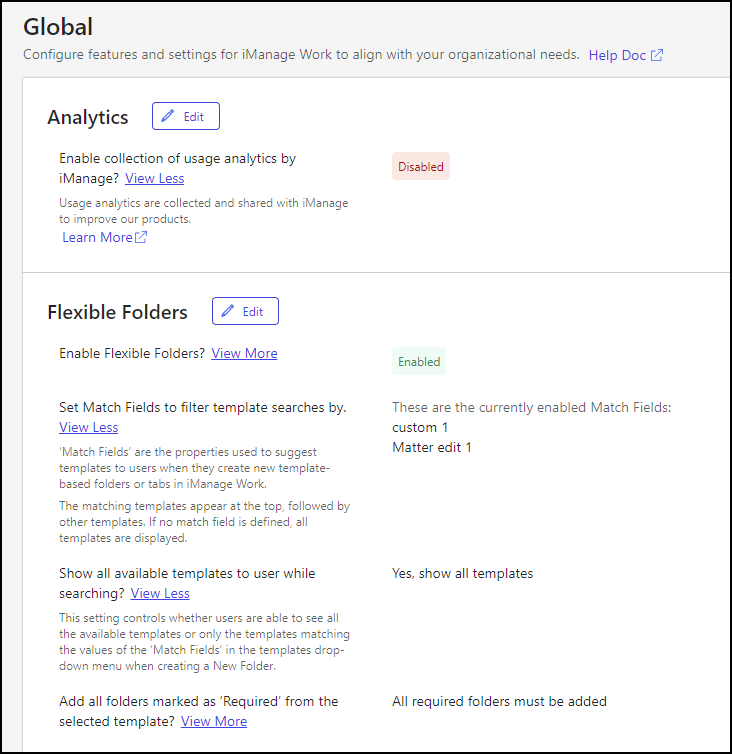 Each setting on the Global settings page includes a brief description to help reduce clutter. To view additional information, you can select the View More link associated with a setting. This link acts as a toggle and changes to View Less when additional information is displayed.