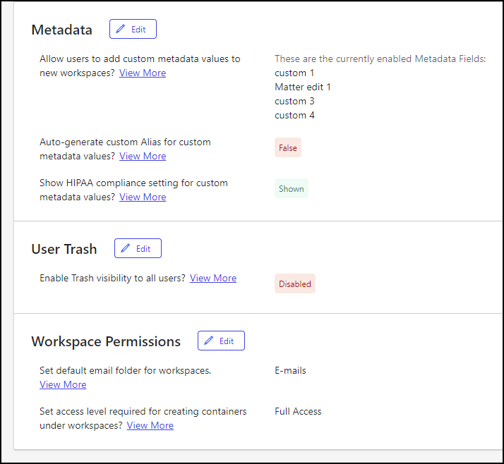 Each Global settings page category includes an Edit button, allowing you to update settings without having to navigate through unrelated options.