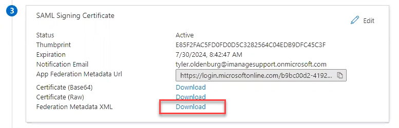 - Faça download do arquivo XML de metadados federados. Na seção Certificado de Assinatura SAML, localize Metadados de Federação XML e selecione Baixar..