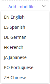 Usando o iManage Control Center, é possível fazer upload de arquivos .mhd individuais para cada idioma compatível: inglês, espanhol, português, francês, japonês, alemão, chinês.