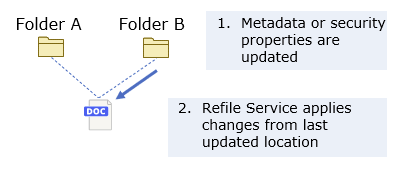 Quando configurado com o Local atualizado mais recentemente, o Serviço de rearquivamento detecta automaticamente as alterações nas propriedades de segurança ou de metadados de qualquer um dos locais referenciados, e propaga as alterações do local atualizado mais recentemente a todos os documentos com várias referências que houver na hierarquia.
