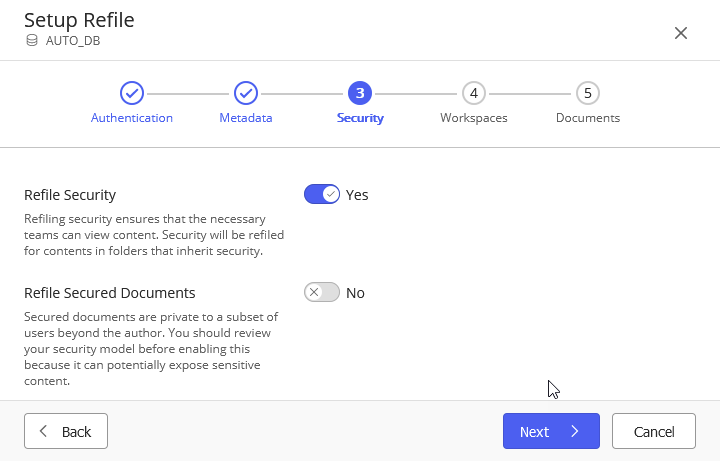 - Segurança padrão: Trata-se do conjunto de configurações de segurança (Público, Privado e Visualização) definidas para cada item, como por exemplo espaço de trabalho, pasta ou documento. As configurações de segurança padrão podem ser definidas manualmente para cada item, ou, como prática recomendada, definidas em um contêiner superior, como um espaço de trabalho. As configurações de um contêiner de nível superior tentarão se propagar para os contêineres e documentos filho situados em níveis inferiores.