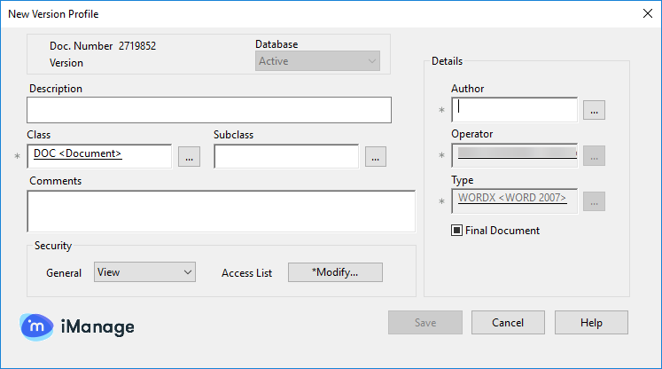 Essa página mostra exemplos dos formulários de diálogo padrão fornecidos com os clientes iManage Work Classic e das propriedades associadas em cada formulário.