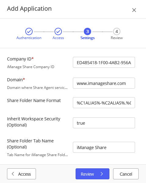 Insira o ID alfanumérico exclusivo de 32 dígitos da sua empresa iManage Share. Os administradores podem acessar este ID no portal da web do iManage Share em Configurações > Perfil da Empresa.