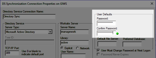 Ao usar a Sincronização de Diretório do iManage para executar sincronização de sentido único automatizada de usuários e grupos do Diretório Ativo para o iManage Work, você deve atualizar a senha padrão para aderir a esses novos requisitos de senha.