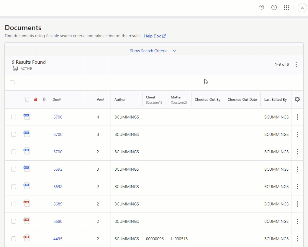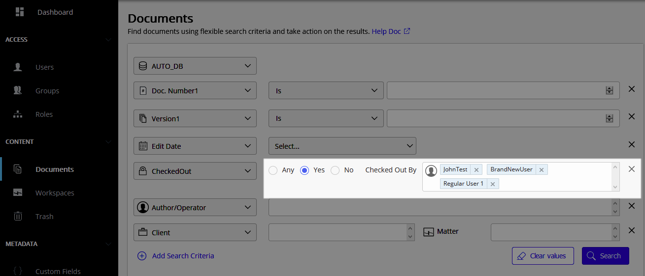 O iManage Control Center agora oferece suporte para pesquisar documentos cujo check-out foi feito por um ou mais usuários específicos.