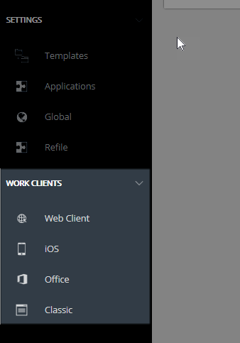 O painel esquerdo no Control Center foi reorganizado para melhorar a navegação. As configurações relacionadas com os clientes do iManage Work agora estão agrupadas na nova seção Clientes do Work.