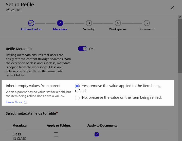 Localize a configuração Permitir a criação de metadados e selecione o menu suspenso para definir quais campos personalizados permitem a criação de metadados.