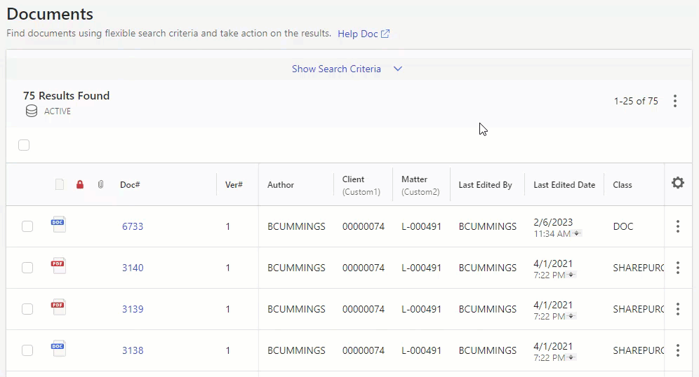 O iManage Control Center agora preserva os campos de pesquisa que você insere ao pesquisar documentos, espaços de trabalho ou itens na lixeira. Quando você adiciona ou remove campos de pesquisa ao fazer uma pesquisa no Control Center, as suas configurações agora são salvas automaticamente, e estarão presentes quando você fizer login novamente e acessar as páginas Documentos, Espaços de trabalho ou Lixeira. Isso oferece a vantagem de não precisar se lembrar ou selecionar novamente os seus campos de pesquisa para pesquisas subsequentes.