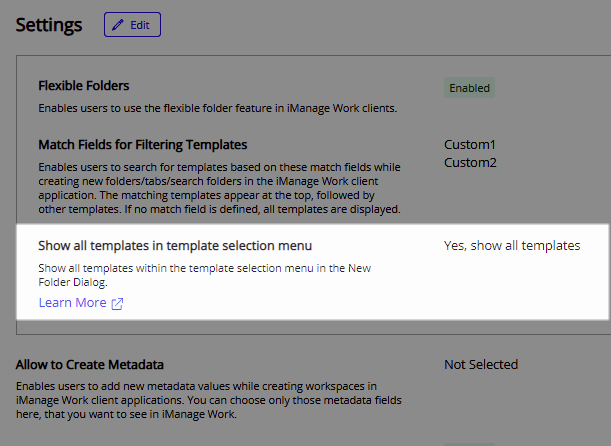 Ao se criar ou modificar um modelo no Control Center, a opção de Reter o prefixo/sufixo do modelo não é mais oferecida. Essa opção controlava se o prefixo ou sufixo sera preservado quando um usuário modificava o nome de uma pasta, de uma pasta de pesquisa ou de uma guia criada por meio do modelo. Essa opção foi removida, porque não era possível aplicá-la uniformemente a todos os clientes do iManage Work.