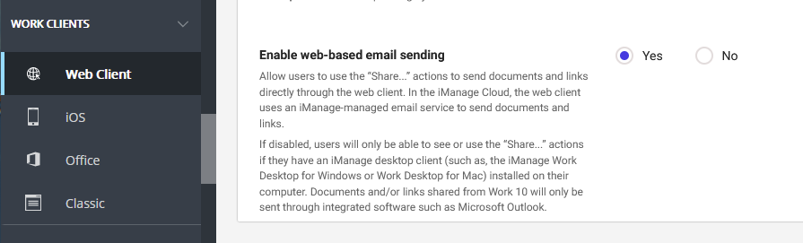 Uma configuração nova foi introduzida para os administradores desabilitarem a opção de enviar documentos e links diretamente pelo serviço de e-mail do iManage Work Web para usuários que não tenham instalado o iManage Work Desktop for Windows ou o iManage Work for Mac clients em suas máquinas.
