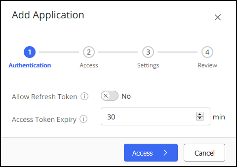 Access Token Expiry: Set the duration of inactivity allowed, in minutes, before invalidating an access token of a user.Select Access, then select from one of the following options: