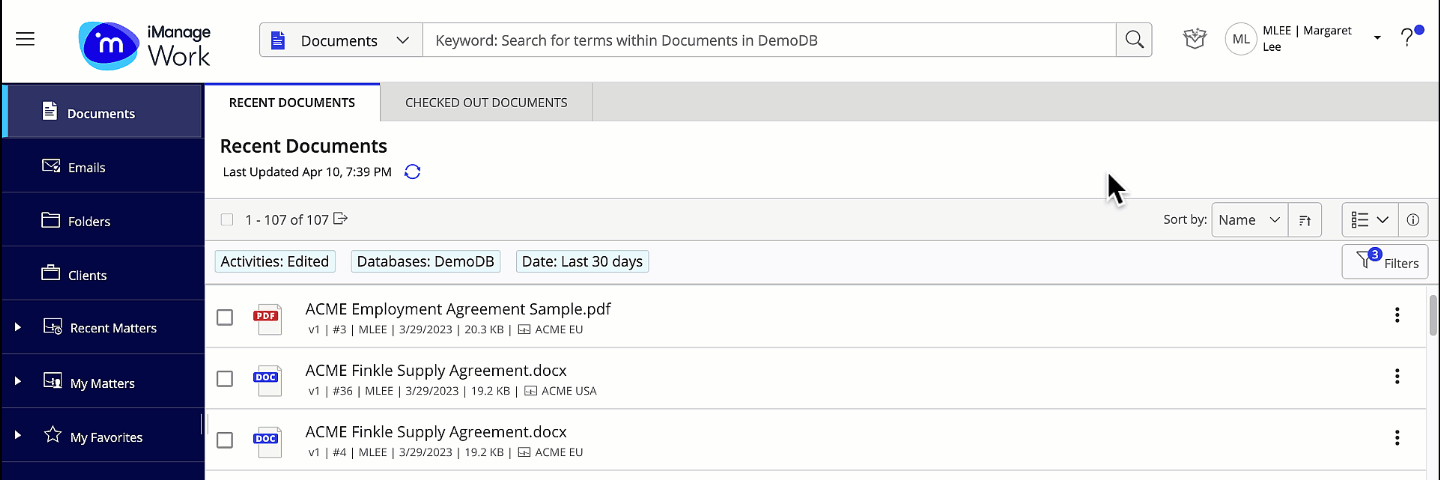 For example—when you search for the term apple, a default search is performed on documents that exist in iManage Work and the search results display a list of documents that contain the search term or its variations. iManage Work performs a full-text search through the document, and if the term or its variations are found anywhere in the document, the document is listed in the results. Here, the search is being performed as a keyword search.