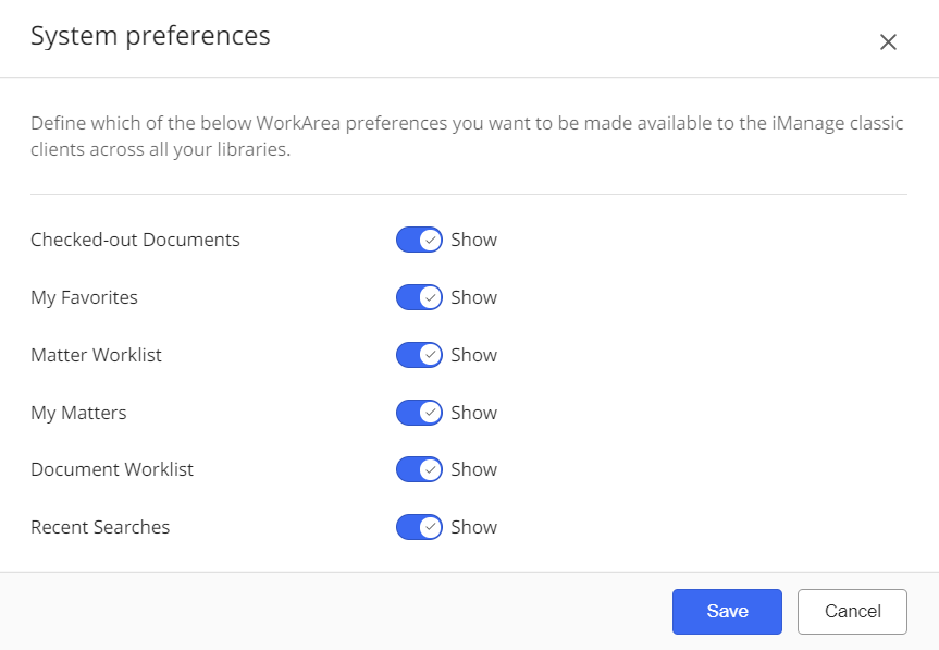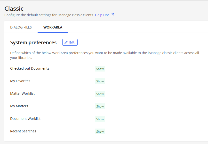 See Managing classic client dialogs for more information. - WorkArea: Manage preferences for iManage DeskSite users.