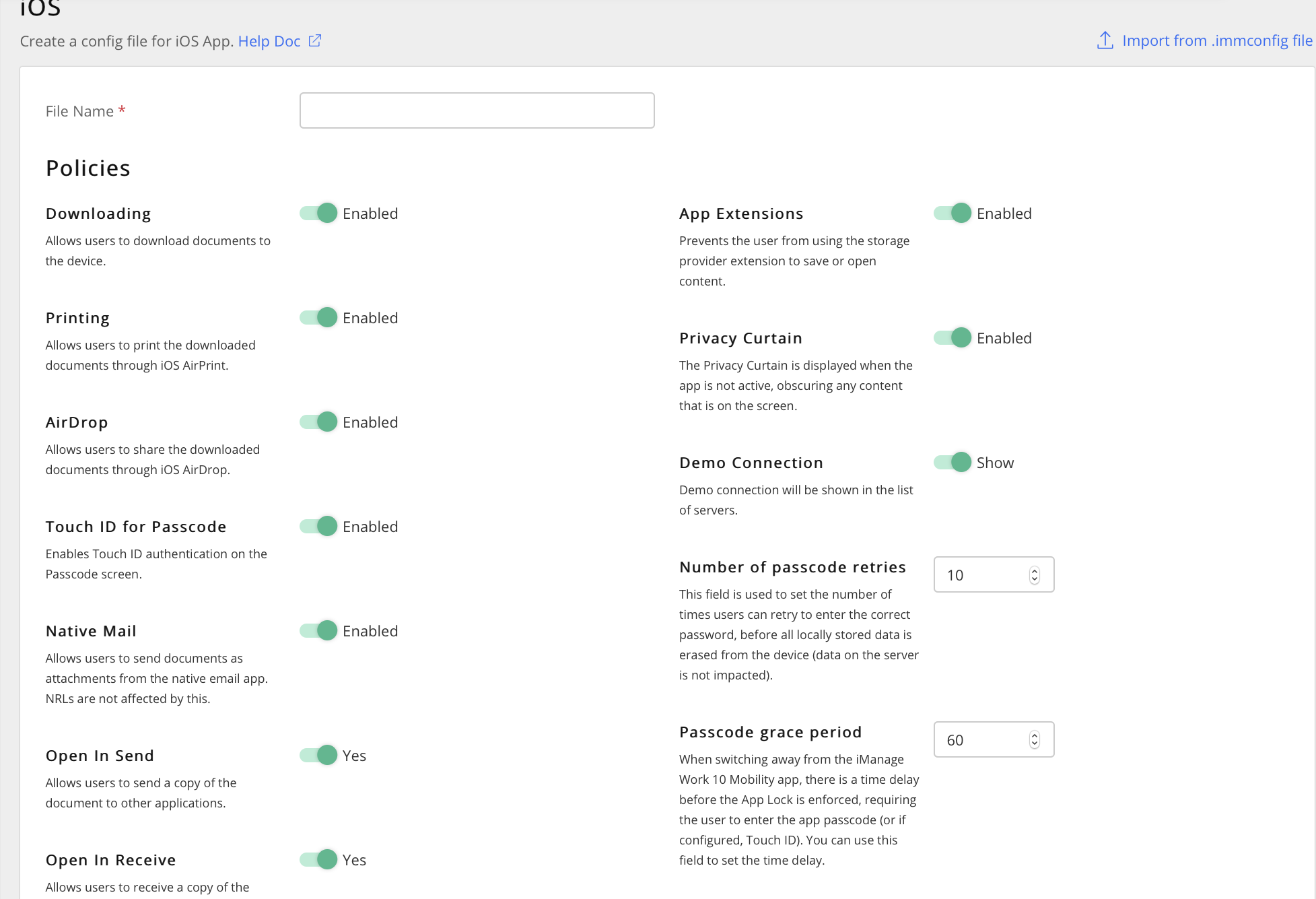 The following table lists the available policies (see Figure: iOS page part 1) in iManage Control Center and a brief description of their use in iManage Work 10 Mobility.