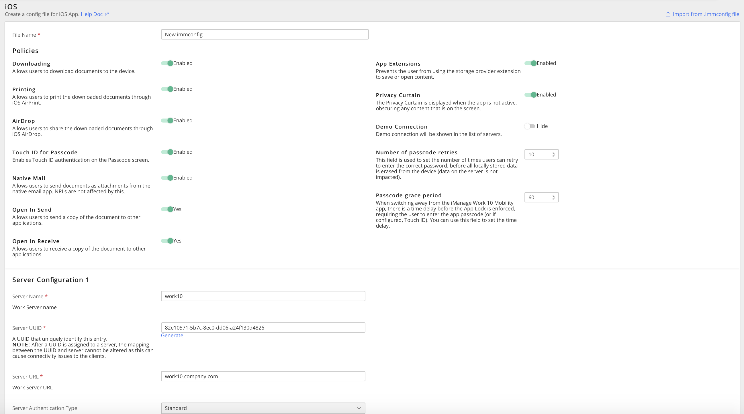 You can use the iOS feature to import an existing .immconfig file and customize policies.