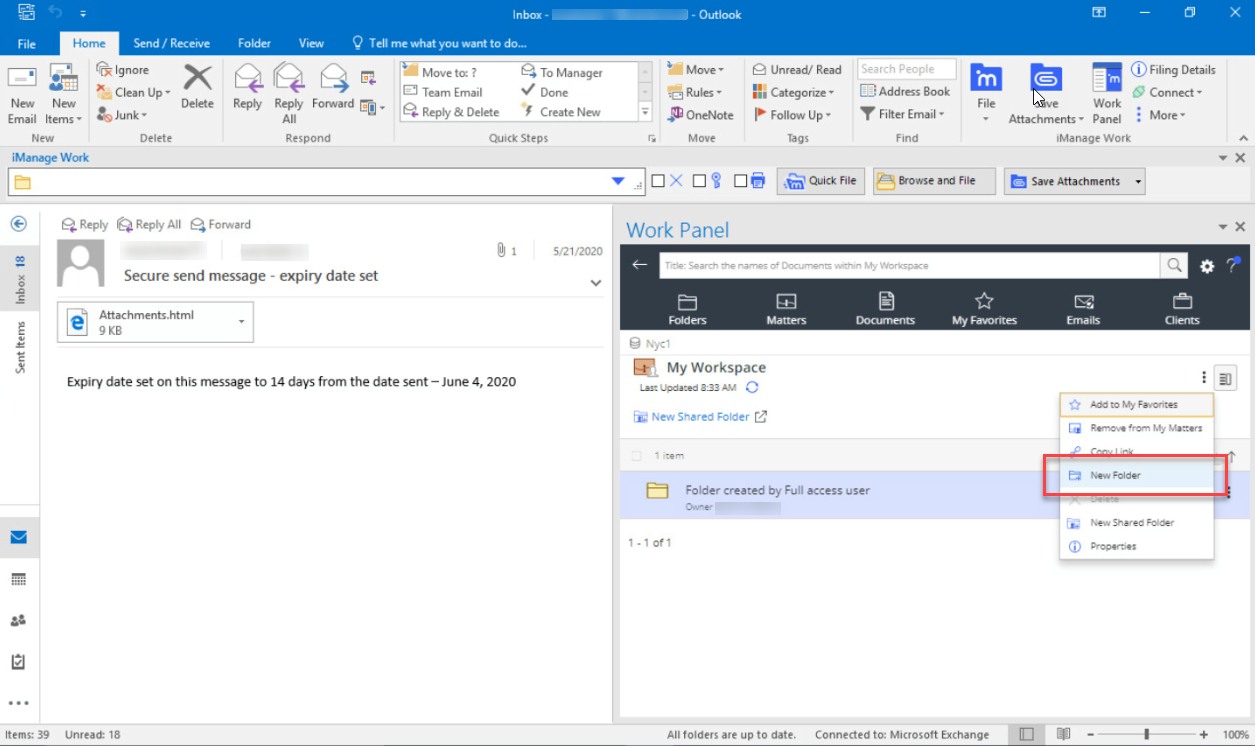 - Enabling compatibility mode and creating the container in the iManage Work panel, as shown: