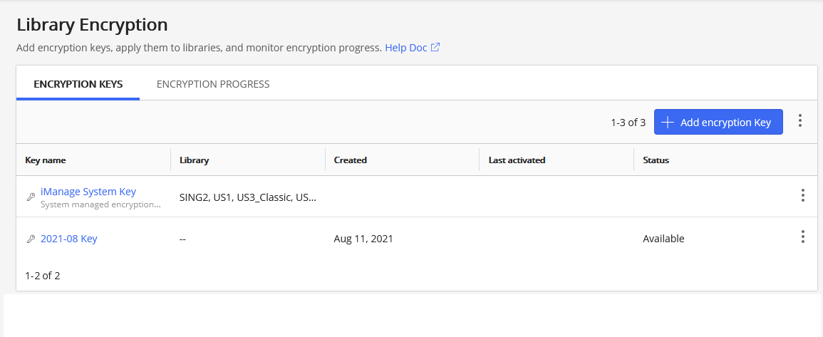 A: Sign in to iManage Control Center as a user with the Key Management privilege enabled for their role. Navigate to Library Encryption, then select the key intended for encryption. Each library will have an individual status. Enabled signifies the key is enabled for that particular library. The iManage System Key is enabled on all libraries by default.