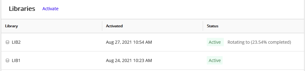 If a key rotation is in process, the status also displays the percentage complete, for example: Active: Rotating to (76.54%). - Inactive: Rotating from: A key rotation (rekeying) process is actively moving from this key to the new key. New content added to this library will not be encrypted using this key.