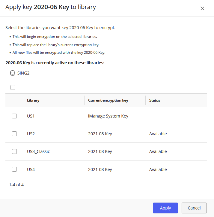 A primary key is activated by applying it to one or more iManage Work libraries. Primary keys can be applied to libraries as needed. The previous primary key is deactivated. As a best security practice, iManage recommends not reusing previously used primary keys. The exception is the built-in iManage system key which can be reapplied at any time.