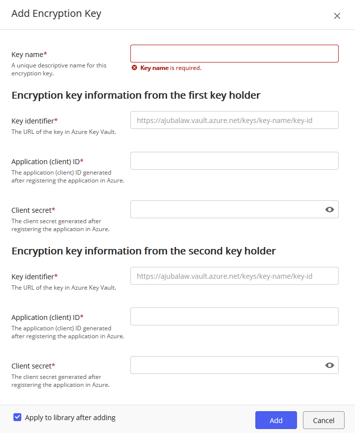 This will automatically open the Apply key to library dialog box. For more information, see Applying a key to an iManage Work library. Select Add. The newly added key is displayed with the status of Available.