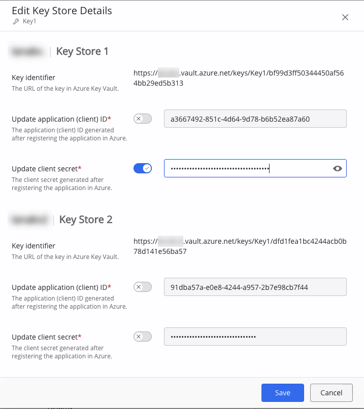 - Generate a new secret for each Key Store in your Azure Key Vault.
