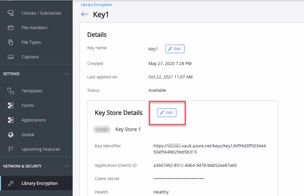 Microsoft Azure generates a secret for Enterprise Applications to grant access to each Key Store in your Azure Key Vault. Microsoft Azure enforces an expiration date on the client secret (maximum 2 years) for each Key Store within Azure Key Vault. If this secret expires, Azure blocks access to the keys stored in the Key Vault. If this occurs, iManage Cloud cannot access the Key Vault, your existing content cannot be decrypted, and new content will not be able to be uploaded or encrypted.