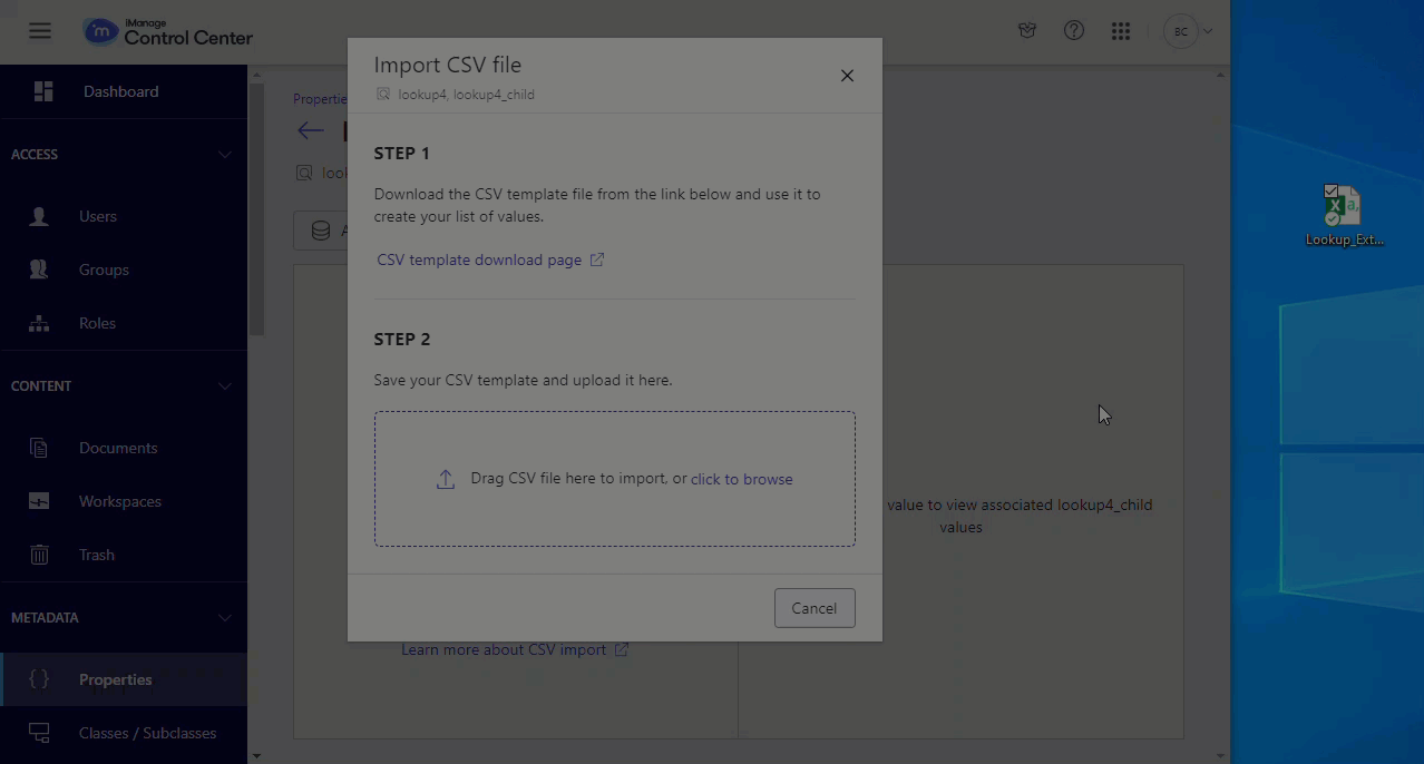 If your session times out while adding values to a lookup or taxonomy property, iManage Control Center may not be able to save your changes.