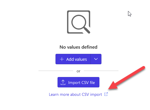 Importing values from a CSV file is allowed only when no other values have previously been added to the property. If you’ve already added values to this property, you can still add additional values using the Add value or Add multiple values options.