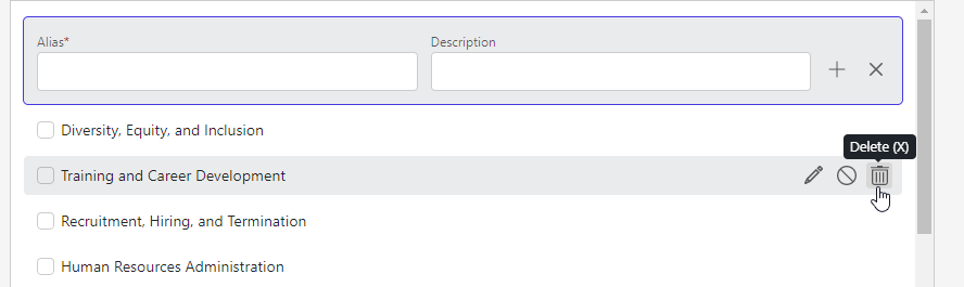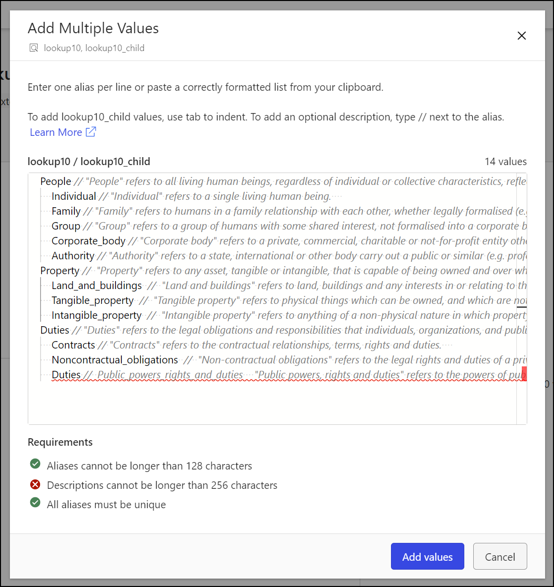 Enter the required alias (ID) and description for the new value, then press ENTER or select the + button to submit the value.