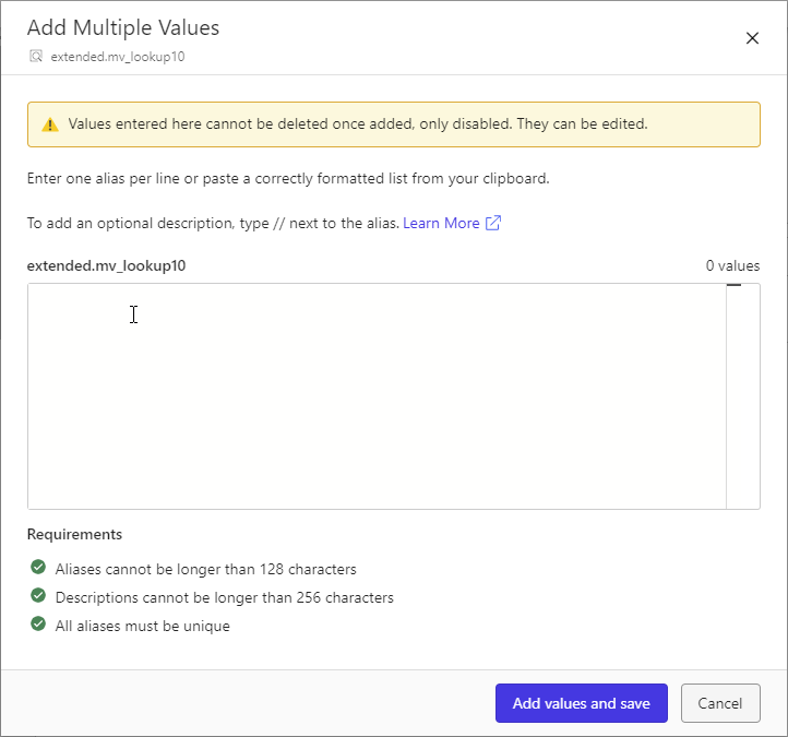 You can also copy values from another application or document and paste them into the editor.Separate the alias and description using the // characters.