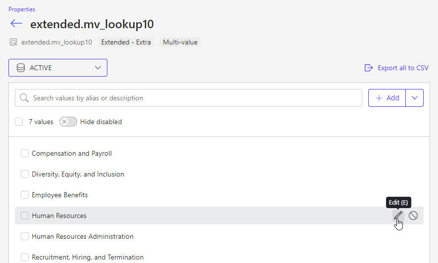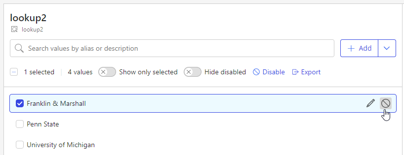 When you disable a value, the value can no longer be applied to a new or existing document. Disabled values can also be re-enabled at any time.