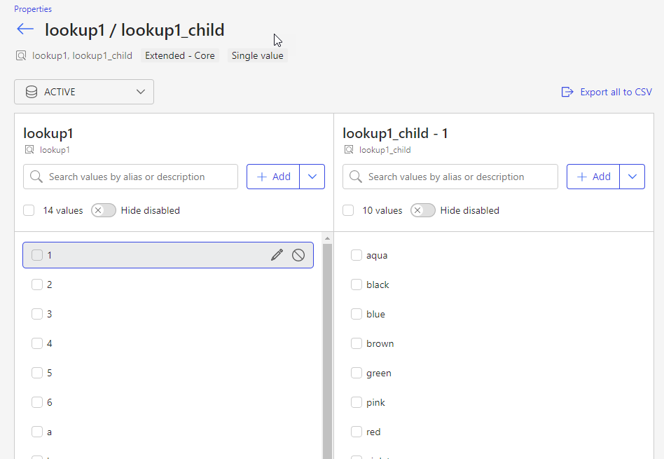 The left panel displays the parent values, and the right panel displays the child values for any parent value you select.
