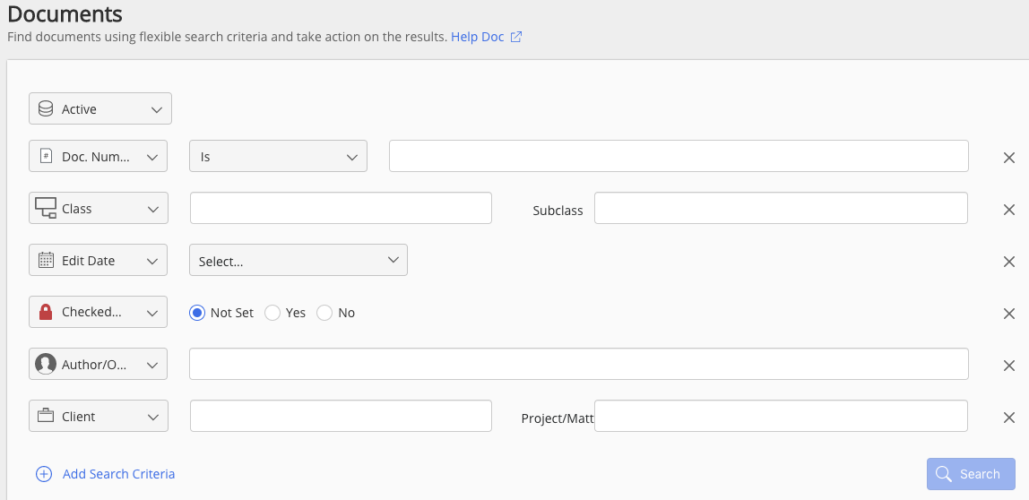 Search | You can precisely search for an item. You can use any number of properties to craft a search that finds an item, or items, quickly and accurately. For example, a search can be broad, looking only for items with a specified Client tag, or all items with a specified lead attorney, regardless of client. The search can be more precise and include the Client, Matter, Jurisdiction, document owner, and/or modified after a certain date. For example, the Client property of one item might be Microsoft, and other one for Coca-Cola. This allows you to do searches using Clients equaling Microsoft. |