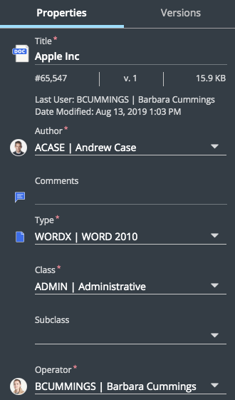 A property is an individual piece, or field, of information that is attached to an object. For example, metadata about a Microsoft Word document is the set of properties that include the file name, the date the document was created, who last modified it, its location on the computer or iManage Work system, and who has access to it, the client and matter the document is assigned to, the billing code, and the responsible lawyer, among other properties. Some properties may be less obvious like its document number, and some may never be intended for users to see, but are required internally for the iManage Work system. Properties have the following characteristics: Value, type, and captions.