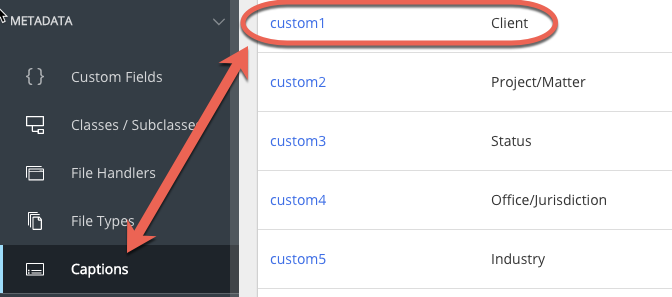 To rename a captions, in iManage Control Center select Metadata > Captions, and then select the individual profile field.