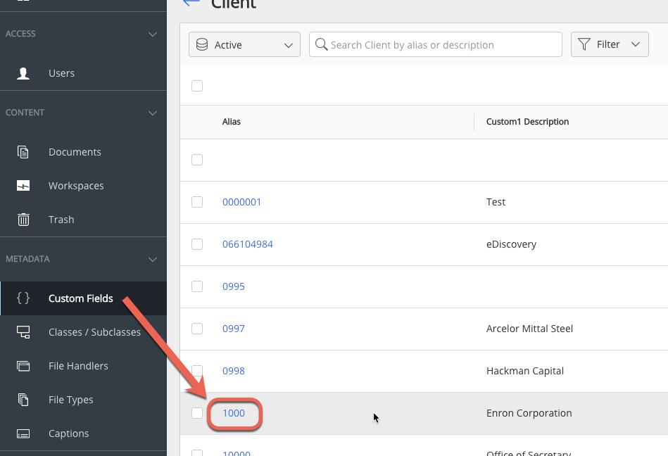 Selecting a Client, for example Enron Corporation, alias 1000, from the previous sample, shows the values available.