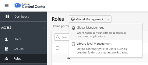 - Global Management: Use this option to view, create, and manage global roles. Global roles are created and managed independent of any iManage Work library, and changes made to the global role are updated at the global level, and not individually at within each library. This is useful to manage privileges for administrative users that access Control Center. Global roles have unique privileges: See Global privilege descriptions.