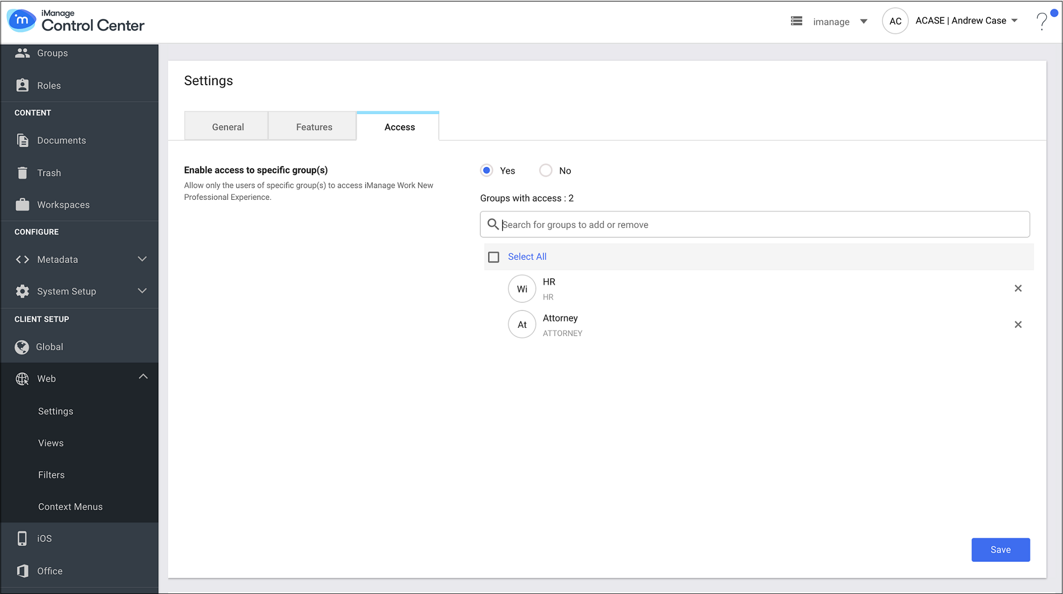 To define which groups can sign in to iManage Work 10 Web, navigate to the Access tab.