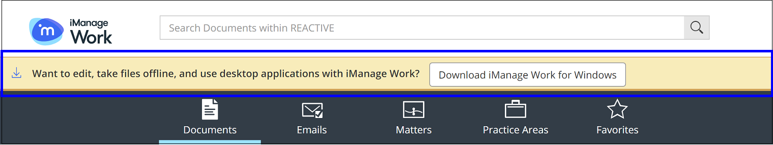 Enable Work 10 Desktop for Windows Auto Updates App Banner | Select the Windows check box if you want your end-users to see the following Enable Work 10 Desktop for Windows Auto Updates App Banner in the iManage Work application (Work Web client). By default, this check box is not selected. Only those end-users who do not have iManage Work Desktop for Windows will see this banner. Figure: iManage Auto Updates Banner