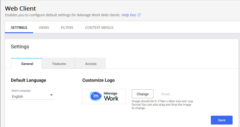 - General: configure general iManage Work 10 Web settings.