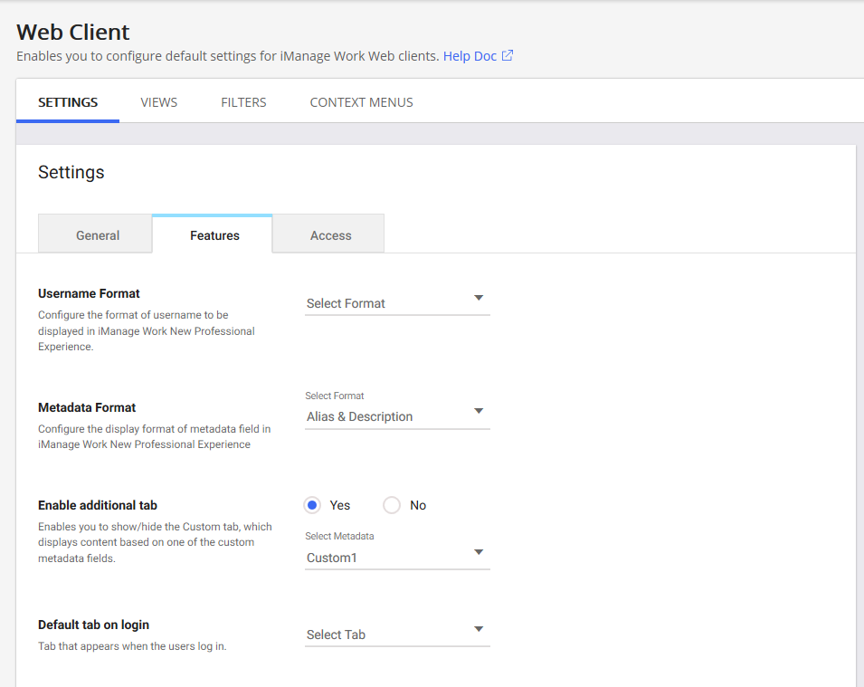 - Features customize different feature options for the iManage Work 10 Web.