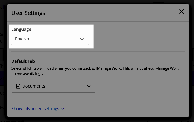 Individual users may also change their default language in iManage Work Web in the User Settings dialog by setting the Language option. This change applies only to their account and applies wherever they sign in to iManage Work.