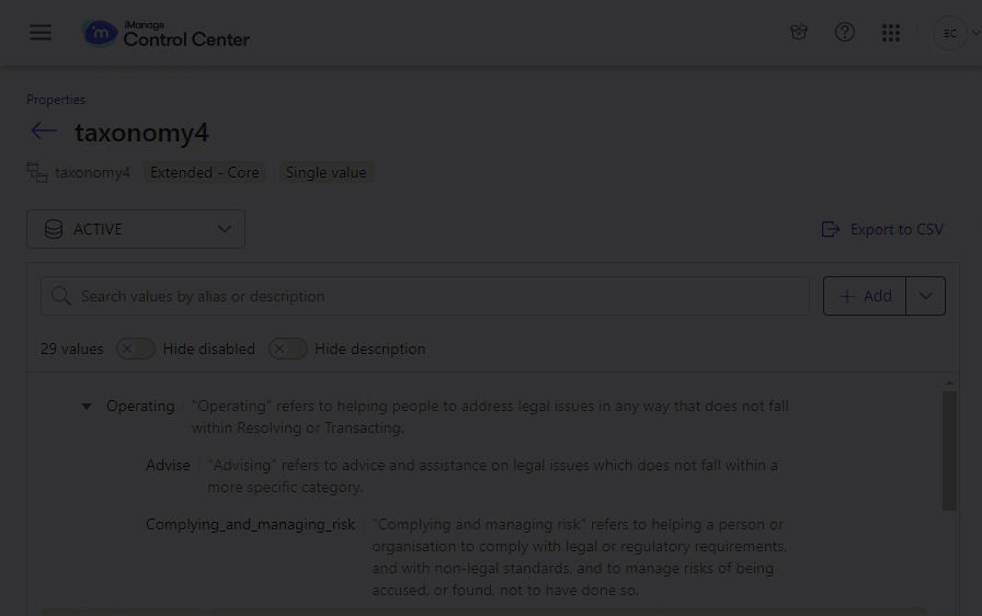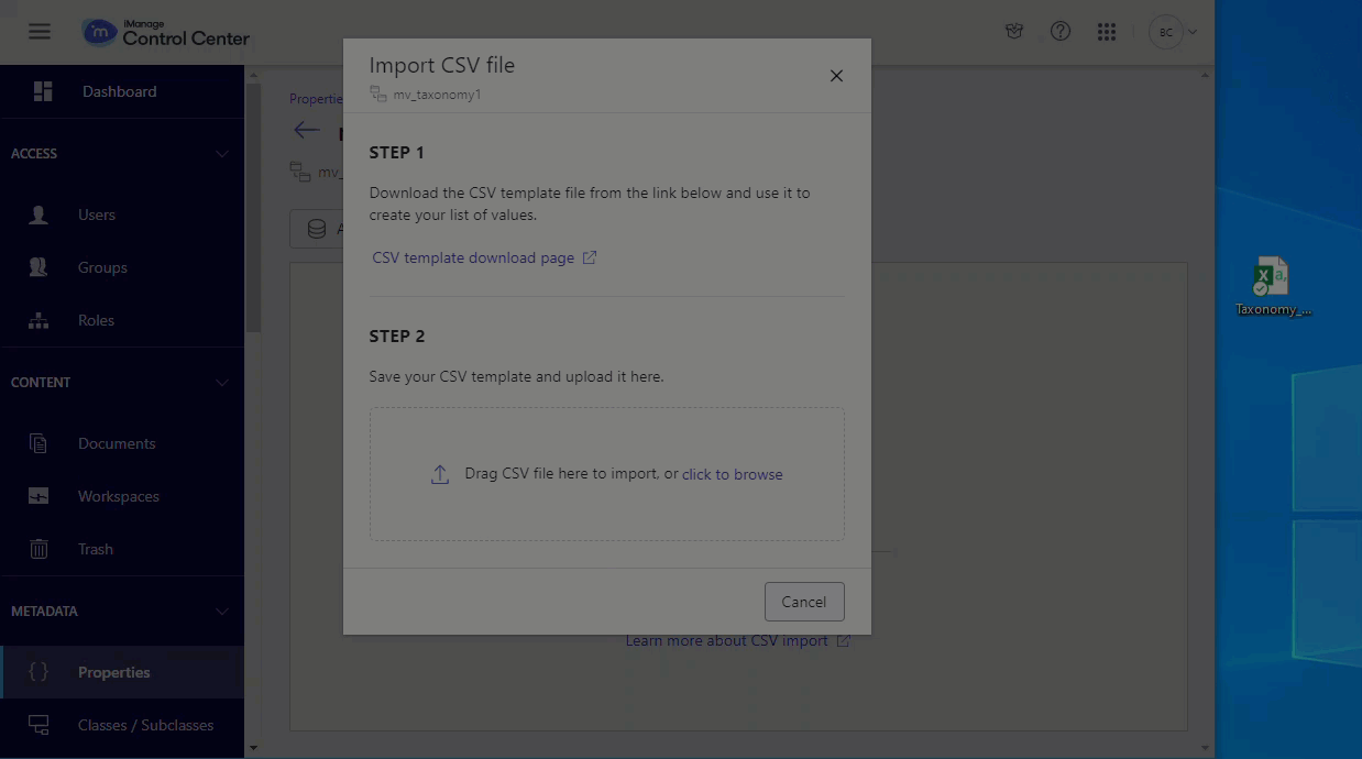 This is also useful for maintaining consistent values across iManage Work libraries. You can export values from one iManage Work library and import these same values to the property in another library. For more information about exporting values, refer to Export values to a CSV file.