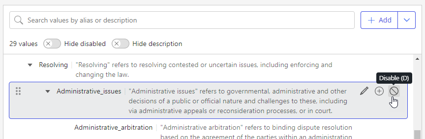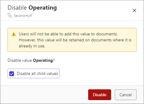 When you disable a value, the value can no longer be applied to a new or existing document. Disabled values can also be re-enabled at any time.