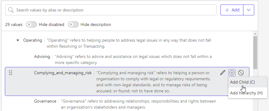 To reorganize the values in the hierarchy, refer to Reorganize taxonomy hierarchy.