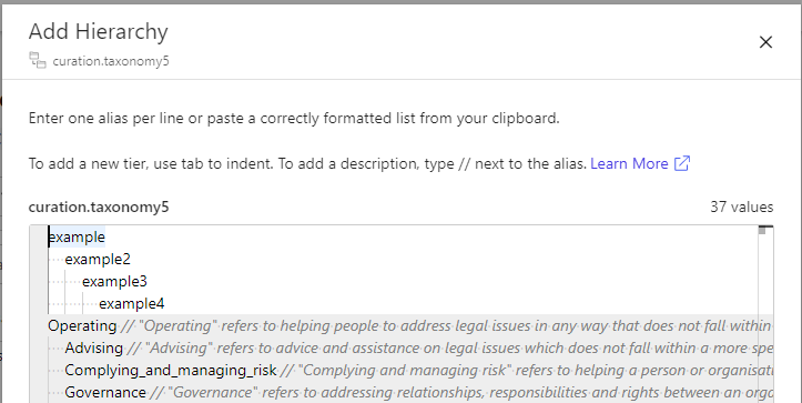 If you have already defined hierarchy values for a taxonomy property, you can also add multiple new values at any level: