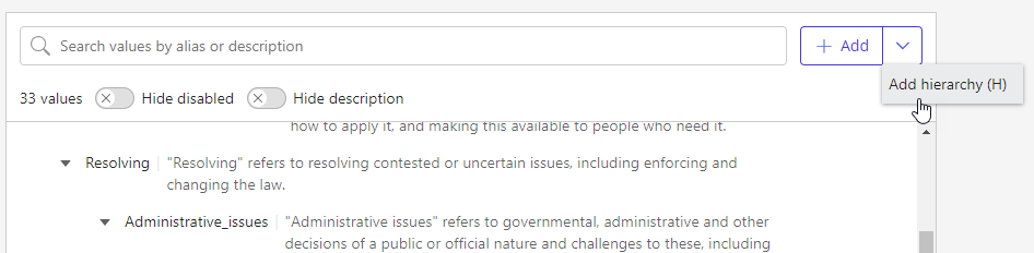 To add values at the top level of the hierarchy, select the +Add dropdown menu, then select Add hierarchy, as shown.